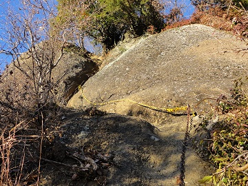 先へ少し行くと第二の岩場で、鉄の杭が打ち込まれた岩壁をトラバースし、ロープで登りますが、高い所が苦手な人は林内経由で行ったほうが安心です。 振り返ると岩殿山が大きく見えます。