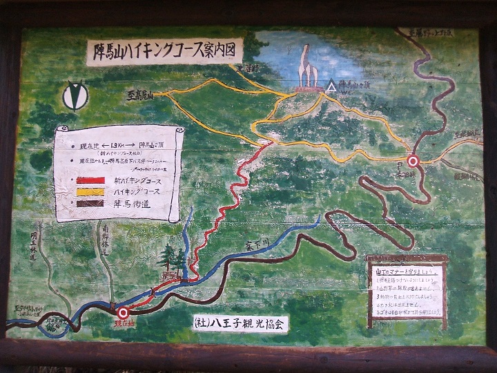 傍らに案内図があり、新ハイキングコースは陣馬山の山頂まで1.9km、陣馬街道を歩いて和田峠を経由すると、傾斜は緩やかですが1.2kmほど距離が長いです。 新ハイキングコースと言っても最近できた訳ではなく、案内図の古さから相当の昔からあるものと思われます。