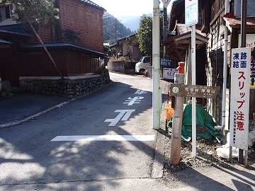 陣馬高原下バス停を出るとすぐに分岐で、直進するのが陣馬高原キャンプ場から底沢峠へ、右が陣馬街道で新ハイキングコースや和田峠への道です。 ここでは右の道を進み、左に案下川を見ながら陣馬街道を1.3km歩くと、陣馬山への新ハイキングコース入口があります。