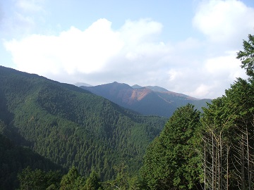 やがて右側の樹木が伐採された明るい道に出ると、西側の展望が得られます。 最奥に見えるのが陣馬山でしょうか。