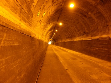 藤野駅から相模湖駅方面へ線路沿いを進んで、踏切を渡ると沢井トンネルです。 沢井トンネルは500mほどあって道幅も狭く、車がけっこう通るので、注意して歩く必要があります。 トンネルを出て、沢井川沿いの県道をしばらく歩くと陣馬登山口バス停です。