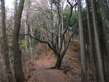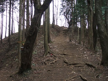 奈良子峠で右からの道が高尾山からの縦走路、左へ進むのが陣馬山への道です。