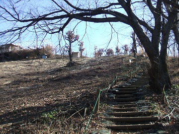 巻き道のある低いピークを越えるなどして、山頂に近づくと長い階段が現れます。 登りきると右から高尾山からの縦走路が合流して、ひと登りで陣馬山・山頂に着きます。