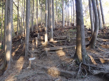 中央道の小仏トンネル上を登っていき、尾根に出るまでは急坂が続きます。 尾根に出ると緩やかな登りとなり、えぐられた道を歩くと、やがて小下沢からの道と合流します。