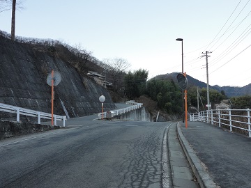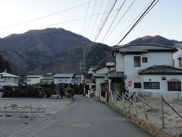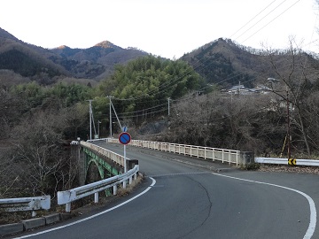 線路から離れ、正面に倉岳山から高畑山への稜線を見ながら、南へ歩いていきます。やがて下りとなり、虹吹橋で桂川を渡ると小篠集落を登っていきます。 右折・左折など複雑ですが、道標が確認しながら進めば迷うことはありません。