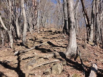 天神山のすぐ先が穴路峠で、上記の分岐からの道が合流します。昔は北の大月と南の秋山を結ぶ主要な道だったそうです。 穴路峠から急坂を登ると緩やかな道となり、やがて倉岳山への急登となります。 登り切ると倉岳山の西の肩で、数分で倉岳山の山頂です。