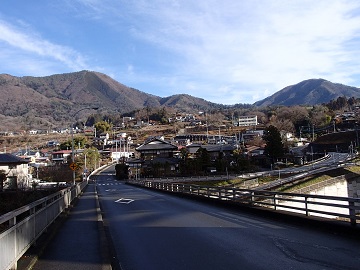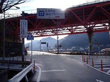 左に百蔵山、右に扇山を見ながら、桂川を渡って中央道をくぐり、葛野川を渡ってT字路の突き当たりを右折。 大月市営総合グラウンドの表示があり、これに従って左折、坂を登っていきます。
