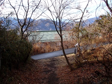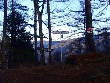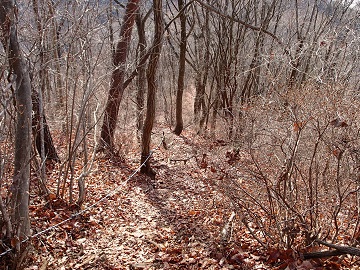 展望地から明るい道を10分も登れば尾根に出ます。 尾根を左へ行くと葛野部落への下り、右へ登るのが百蔵山への道で、山頂までは15分ほどの緩やかな登りです。