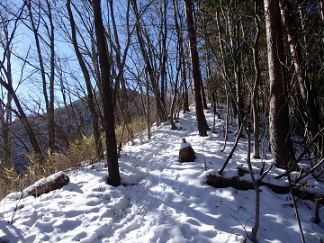 仙人水をすぎて、落石注意の表示がある荒れた道をジグザグに登ると尾根に出ます。 しばらくはダラダラとした登りが続き、やがてロープの張られた急坂を登っていけば、石塔が立つ二十六夜山に着きます。