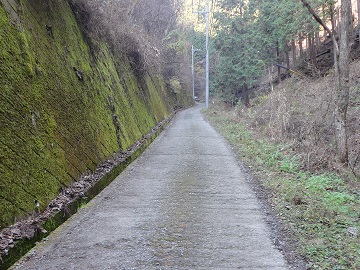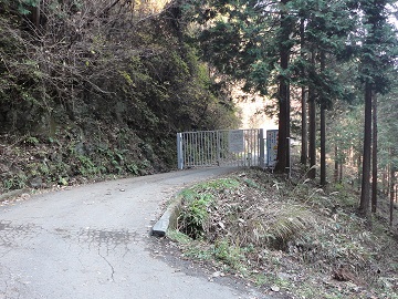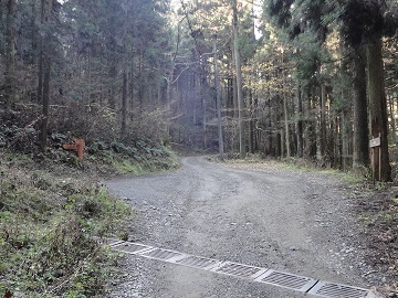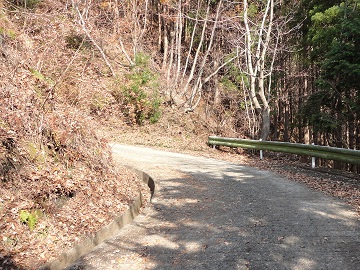 管理小屋をすぎるとかなりの急坂になり、車止めゲートを脇を抜けて、左右にカーブしながら登ります。 かなり下のほうに歩いてきた道が見えるようになります。