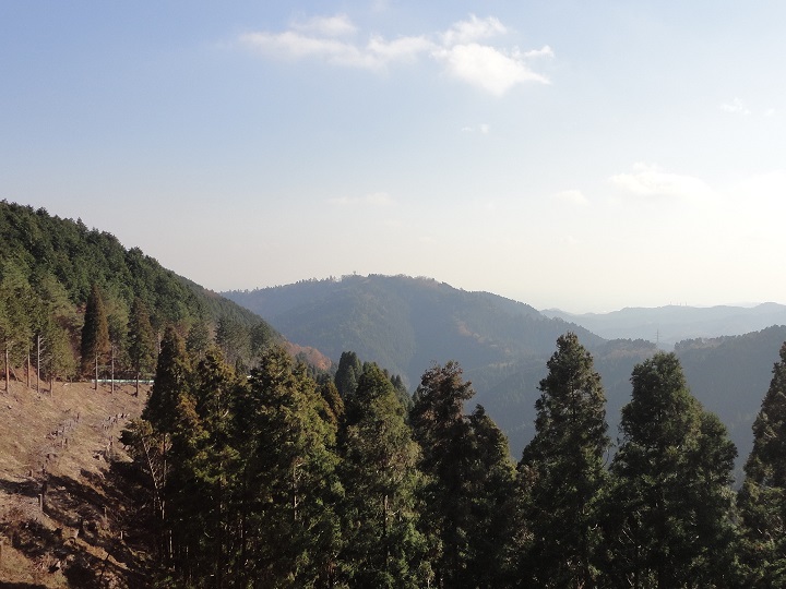 展望のよい道を緩やかに登っていき、振り返ると高尾山から小仏城山にかけての道が見わたせます。 やがて、小仏城山を巻く道を横切ると山頂に着きます。