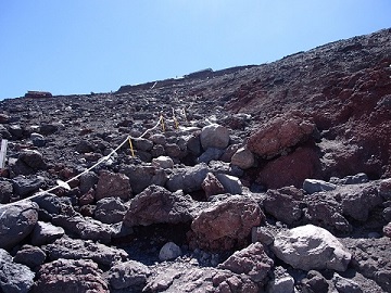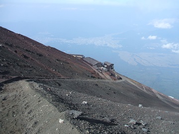 本六合目を出ると樹木がほとんどなくなり、かなり傾斜が増します。 大きな溶岩がゴロゴロした急坂をジグザグに登って七合目に向かいます。 七合目には太陽館があり、標高は2920m。やがて3000mを超えると空気が薄いせいか、足取りがだんだん重くなってきます。 七合目から砂礫の急坂をジグザグに登り、鳥居をくぐると見晴館の建つ本七合目(標高3190m)です。