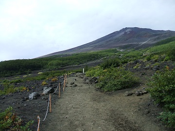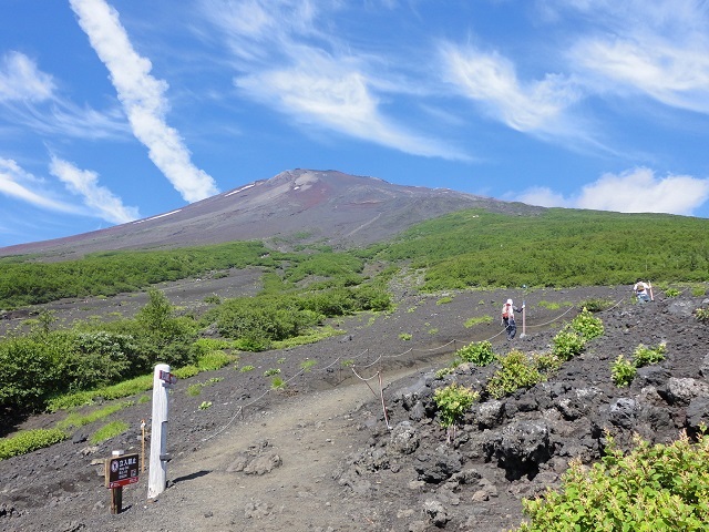 六合目を出るとすぐに灌木帯に入りますが、徐々に見晴らしがよくなり、振り返ると山中湖が見えます。 やがて標高2700mの本六合目で、瀬戸館が建っています。
