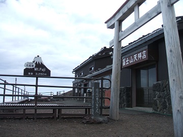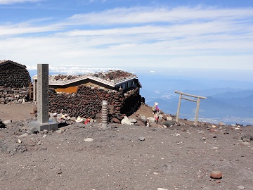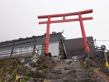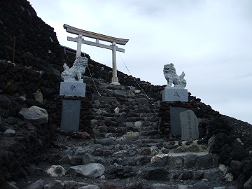 九合目を過ぎてもしばらく砂礫の道が続きますが、山頂に近づくと傾斜がかなり急な岩の道なり、一番きついところです。 急坂を登りきって、狛犬の間を通り、鳥居をくぐると吉田口・須走口の山頂である久須志神社に着きます。