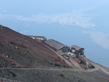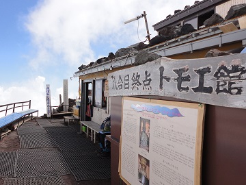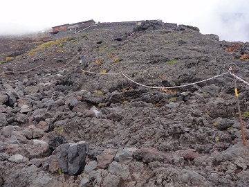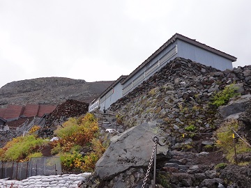 さらに落石防止堤のあるスロープの急坂ををジグザグに登っていき、富士山ホテルを抜けると本八合目(標高3360m)に着きます。 ここで須走口登山道と合流し、さらに人が多くなります。本八合目にはトモエ館と須走口側に胸突江戸屋があります。