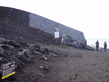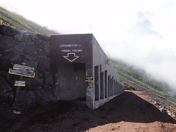 落石防止のシェルター内を通ると富士山安全指導センターに着き、ここから吉田口登山道に入ります。 少し登ると六合目(標高は2390m)に着き、左で山頂からの下山道が合流しています。