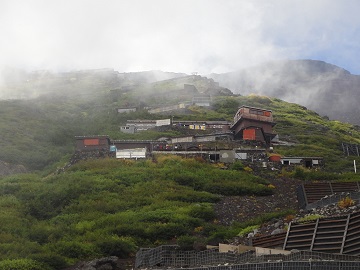 六合目から七合目へは、落石防止のバリケードをしてある砂礫の広い道をひたすらジグザグに登っていきます。 上を見ると七合目の山小屋が建ち並んでいるのが見えます。七合目の最初の山小屋が花小屋で標高2700mです。