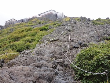 花小屋を出ると道がガラッと変わり、鎖の張ってある傾斜の急な岩場の道になるので、足元に注意して登っていきます。 七合目には山小屋が7軒あり、花小屋から5分毎くらいに日の出館、トモエ館、鎌岩館、富士一館、鳥居荘と山小屋が次ひっきりなしに続きます。