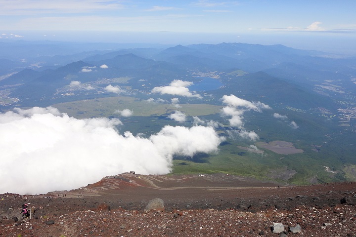 吉田口山頂からは、登ってきた登山道や山中湖や河口湖などを見渡せます。