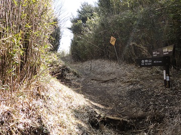 金時登山口バス停から指導標にしたがい車道を10分ほど歩くと登山口に着きます。 登山口からハコネダケの茂る森に入り、20分ほど緩やかに登っていくと、森から出て矢倉沢峠に着きます。