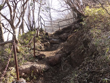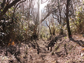 林道を数分行き、右の登山道に入って少し登ると、本来の登山道に出ます。 乙女峠までは、大きな石がゴロゴロとした樹林の荒れた道を25分ほど登ります。展望はありません。
