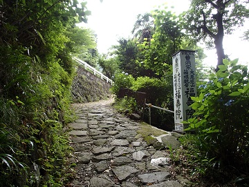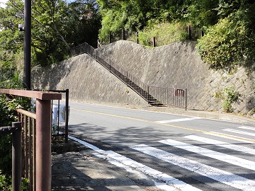 見晴茶屋から10分ほど石畳を歩くと猿滑坂で、猿でもたやすく登れないのが名前の由来だそうです。 横断歩道を渡り、反対側の階段を登っていきます。