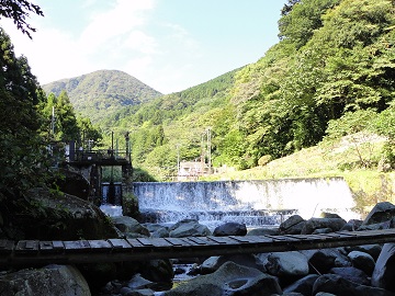自然探勝歩道に入ると樹林の道がしばらく続き、発電所の須雲川に架かる丸太橋を渡り、再び県道に出ます。