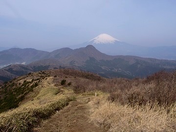 しばらくハコネダケに覆われたアップダウンが続いて展望があまりよくありません。 やがて登りが終わり、金時山が大きくなるにつれて、富士山が隠れていきます。 眼下に仙石原を見ながら下っていけば矢倉沢峠です。