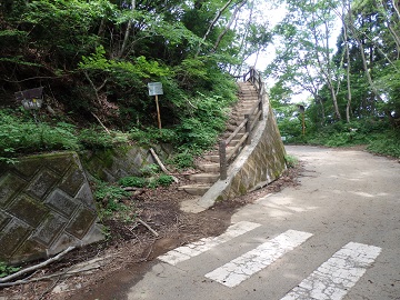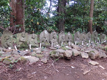 明神橋を渡って登山道に入ります。12体の石仏を見ると未舗装の林道を横切ります。 しばらく歩いて舗装されている林道を横切ると見晴小屋に着きます。