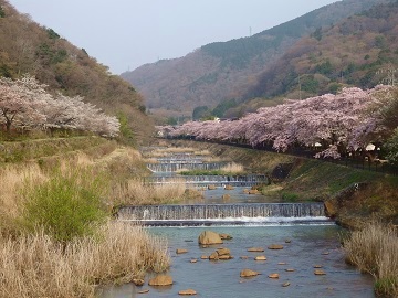 階段を下り切ると国道138号線の宮城野橋バス停。早川に架かる橋で、上流には桜並木があります。