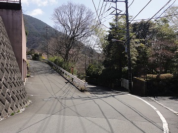 道標にしたがって、会社の保養所などが並ぶ車道を緩やかに登っていきます。 早川渓谷への分岐をすぎて、坂を上っていけば登山口に着きます。