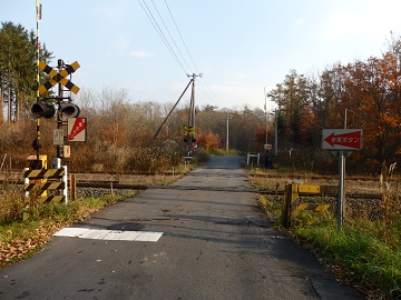 六合目まで車で行くこともできますが、観光の場合は赤井川駅から歩くか、大沼公園駅からタクシーになります。 赤井川駅から駒ヶ岳駅方面へ、畦道を100mほど歩いて踏切を渡ります。