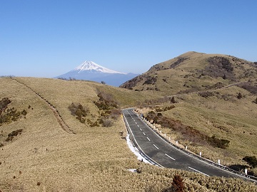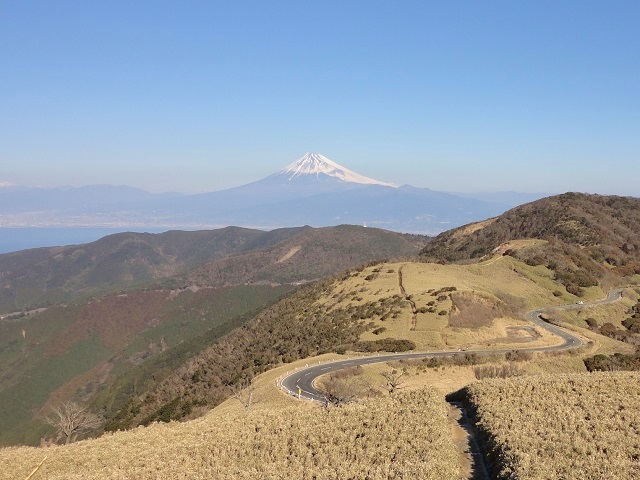 達磨山から展望のよい尾根を下ると、西伊豆スカイラインの戸田駐車場です。 ここからは船原峠までは西伊豆スカイラインの車道歩きと、それをショートカットする登山道の繰り返しで、古稀山などの小ピークをいくつか越えていきます。 振り返ると富士山と達磨山が見えます。