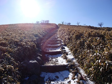 いったん西伊豆スカイラインを少し歩き、再び登山道に入ると階段が長く続いて辛いです。 斜面は笹に覆われているので、富士山や駿河湾の展望が素晴らしいです。