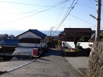 県道を横切ると海岸沿いに龍宮神社と産毛石があり、宇根展望台からは大島が見えます。