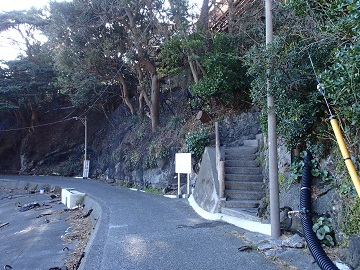 伊豆急・富戸駅から坂を下っていき、酒店前で右折し、城ヶ崎海岸→の表示にしたがって細い道を下っていきます。