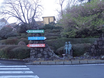 国道135号線との交差点が、小室山ウォーキングコースの入口で、モニュメントがあります。 国道に出ると伊東商業高校バス停があり、伊東駅や一碧湖、大室山などへの便があります。