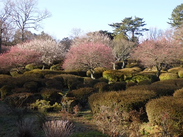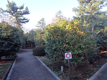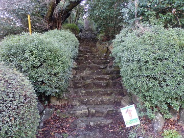 モニュメントの右側から石段を上がって、小室山公園・つばき園に入ります。 つばき園の遊歩道を歩き、富士見邸をすぎると市営グラウンドで、目指す小室山が見えます。