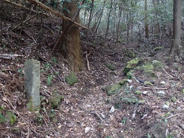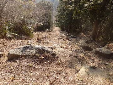 高根山を出ると標高差150mほどを一気に下ります。 転がり落ちそうな急な下りで、右に太いロープがあります。 下りきって蓮台寺駅への分岐をすぎると、しばらく緩やかに下っていきます。