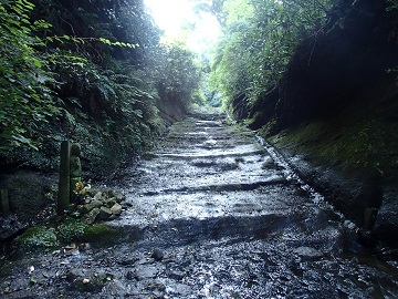 コースに入ったところに朝夷奈切通の碑と三郎滝があり、岩肌から清水が湧き出している坂道を登っていきます。