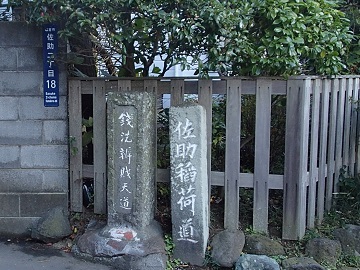 佐助トンネルからの道が合流すると、みのわ(くずきりの店)があります。 すぐ先で道が分かれ、左が佐助稲荷神社へ、直進が銭洗弁天への道です。 角には銭洗弁財天道、佐助稲荷道の石碑が立っていで、標識には銭洗弁天まで450mとあります。 住宅街を進んで民家がなくなると、とんでもない急な登り坂になり、途中に銭洗弁天の入口があります。 そのまま急坂を登っていけば源氏山公園です。