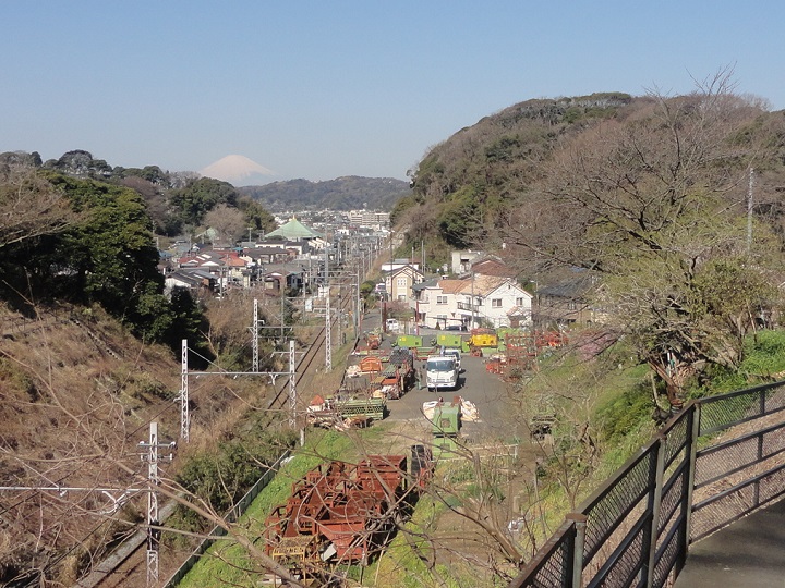 幼稚園や住宅地を左に見ながら、鎌倉市こども自然ふれあいの森を歩いていくと、関東の富士見百景があります。 やがて水路を渡って右の山道に入ります。そのまま広い道を登っていくと展望広場です。