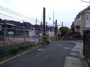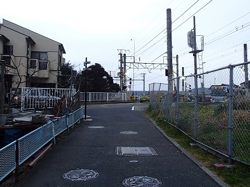 | 住宅地を下る | 踏切を渡る |
