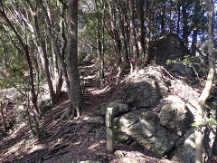 林道口から鋸山山頂へは1.4kmです。 登山道に入るとしばらく緩やかな道で、やがて登りになるとベンチの置かれた岩場から南側が見渡せます。 しばらく急登して登り切ると広い場所に出て、安兵衛井戸と沢コースというのが下っています。