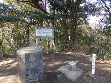 さらに丸太の階段などが続き、登り切ると標高329.5mの鋸山山頂で、一等三角点があります。 狭い山頂は樹林に囲まれているので東京湾の一部が見える程度です。