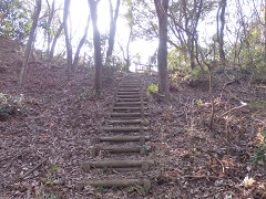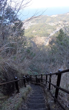 鋸山からは東京湾を望む展望台、石切場跡を経て、浜金谷駅へ下ります。 鋸山を出てテレビ中継所をすぎると、しばらく丸太の階段のアップダウンが続きます。 やがて大きな岩を見ると、東京湾を望む展望台への分岐です。