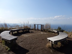 分岐から50m先が東京湾を望む展望台で、ベンチが円形に置かれていて、360度の大展望です。 ロープウェイの山頂駅や金谷港、南房総の海岸線などが見渡せます。