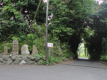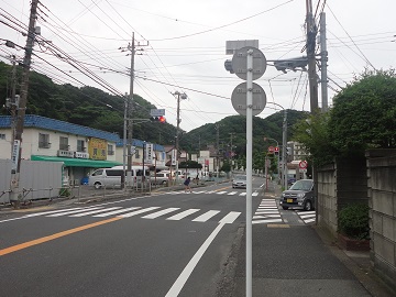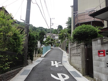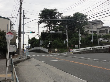 横浜横須賀道路のインターをくぐって大通りをしばらく歩き、トンネルの手前で信号を渡り、本円寺方面への小道に入ります。