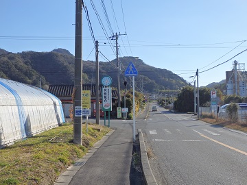 小学校、白寿延命地蔵尊をすぎると歩道があり、正面に富山を見ながら安心して歩けます。