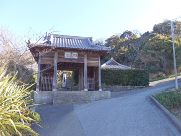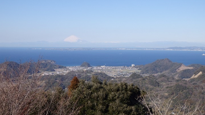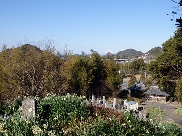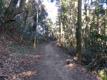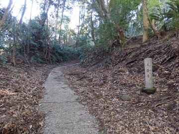 仁王門から墓地を右に見て坂を上がると登山道に入ります。冬には水仙が咲き、振り返ると富士山が見えます。 登山道は階段や舗装された小道の急坂が続いて息が上がります。一合目、二合目と標柱が置かれ、目安になります。 四合目をすぎると広い道となり、しばらく下りが続きます。